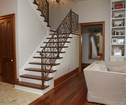 Elegant Common & Select mix of reclaimed Longleaf Pine 1x8 floors and stair treads.